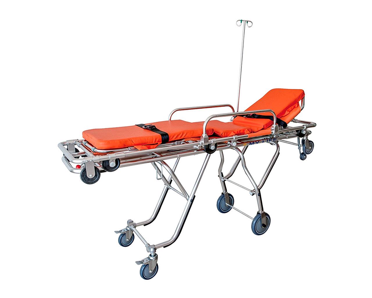 Barella carrozzina multiposizione. Questa barella può essere utilizzata separatamente, configurazione particolarmente adatta al sistema di emergenza. Può essere usata anche su alcuni tipi di ambulanza. Nelle aree di difficile accesso, come ad esempio ascensori e corridoi stretti, la barella può diventare una sedia a rotelle.
