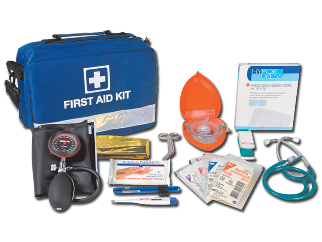 Borsa per primo soccorso piena, dotata di 2 tasche interne trasparenti, una tasca esterna, un divisore interno con 2 cerniere a ogni lato, una maniglia di trasporto e una cintura.