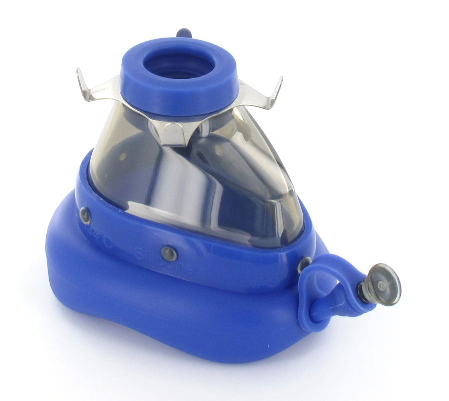 Mascherina Gima Plus fornita con cuffia di gonfiaggio in silicone blu e cupola trasparente in polysulfano infrangibile. Utilizzabile con qualsiasi pallone o respiratore polmonare.
