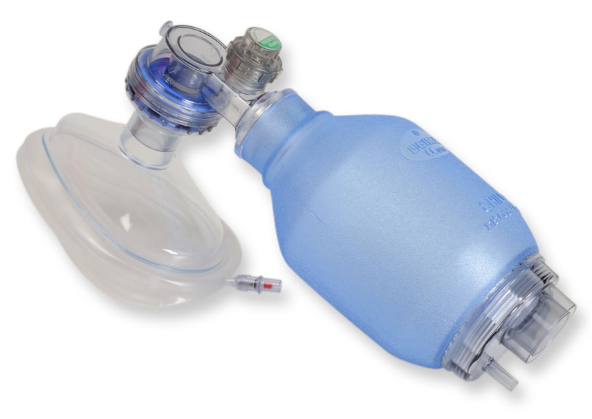 Pallone rianimazione con mascherina bambini monouso N°3. Sprovvisto di valvola POP-Off 40 cm H2O con membrana antiriflusso e adattatore per valvola PEEP. La mascherina trasparente è realizzata in modo da aderire perfettamente al viso del paziente.