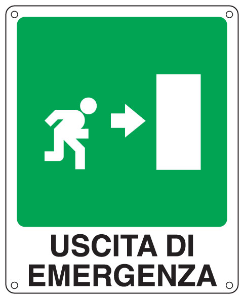 Cartello di "uscita di emergenza a destra" in alluminio con bioadesivo in acrilico retinato capace di garantire una perfetta durata e tenuta su qualsiasi superficie, con particolare attenzione a muro, cemento, mattone, legno e metallo.