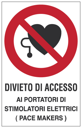 Etichette di divieto autoadesive con dicitura "divieto di accesso ai portatori di stimolatori elettrici (pace makers)"