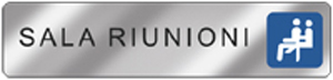 Targhetta Easy Fix riportante la dicitura "Sala Riunioni", in alluminio specchio con biadesivo in acrilico retinato capace di garantire una perfetta durata e tenuta su qualsiasi superficie, con particolare attenzione a muro, cemento, mattone, legno e metallo.
