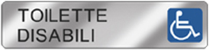 Targhetta Easy Fix riportante la dicitura "Toilette Disabili", in alluminio specchio con biadesivo in acrilico retinato capace di garantire una perfetta durata e tenuta su qualsiasi superficie, con particolare attenzione a muro, cemento, mattone, legno e metallo.