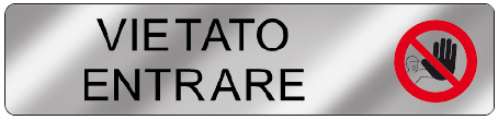 Targhetta Easy Fix riportante la dicitura "Vietato Entrare", in alluminio specchio con biadesivo in acrilico retinato capace di garantire una perfetta durata e tenuta su qualsiasi superficie, con particolare attenzione a muro, cemento, mattone, legno e metallo.