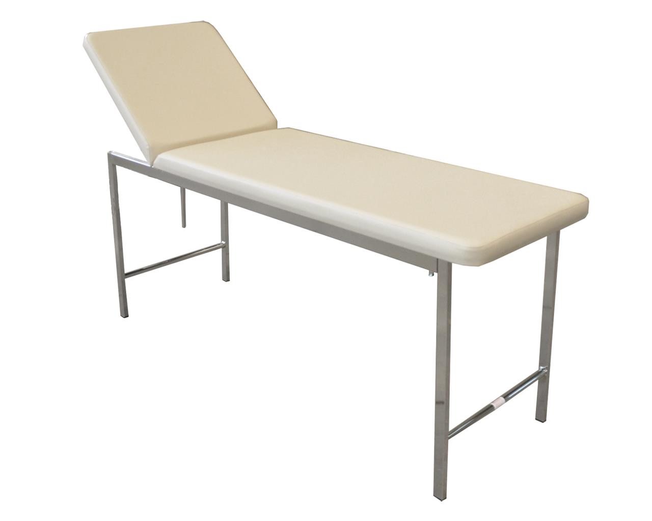 Lettino classico da visita medica a 2 sezioni, con struttura in acciaio cromato e gambe con piedini in plastica. Il piano è composto da due sezioni imbottite in schiuma resiliente, rivestite in similpelle, materiale lavabile e ignifugo. Lo schienale è completamente regolabile.