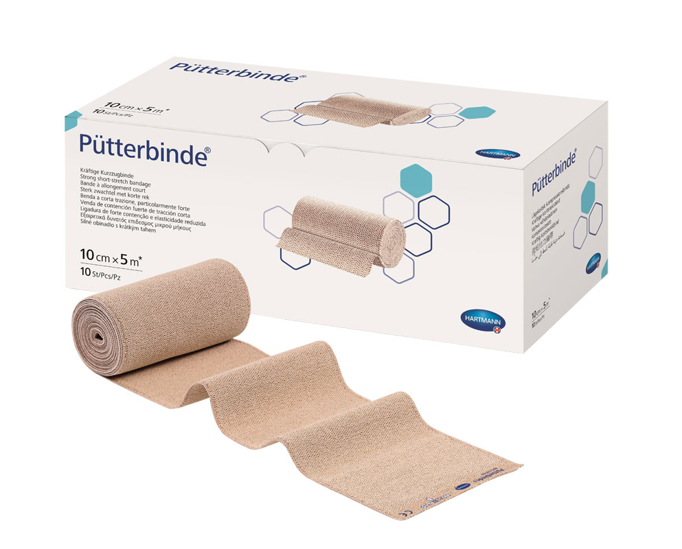 Pütterbinde® è una benda compressiva in cotone a corta estensibilità (circa 90%). Produce forte pressione di lavoro e una bassa pressione di riposo, estremamente durevole. Benda color carne, priva di lattice.