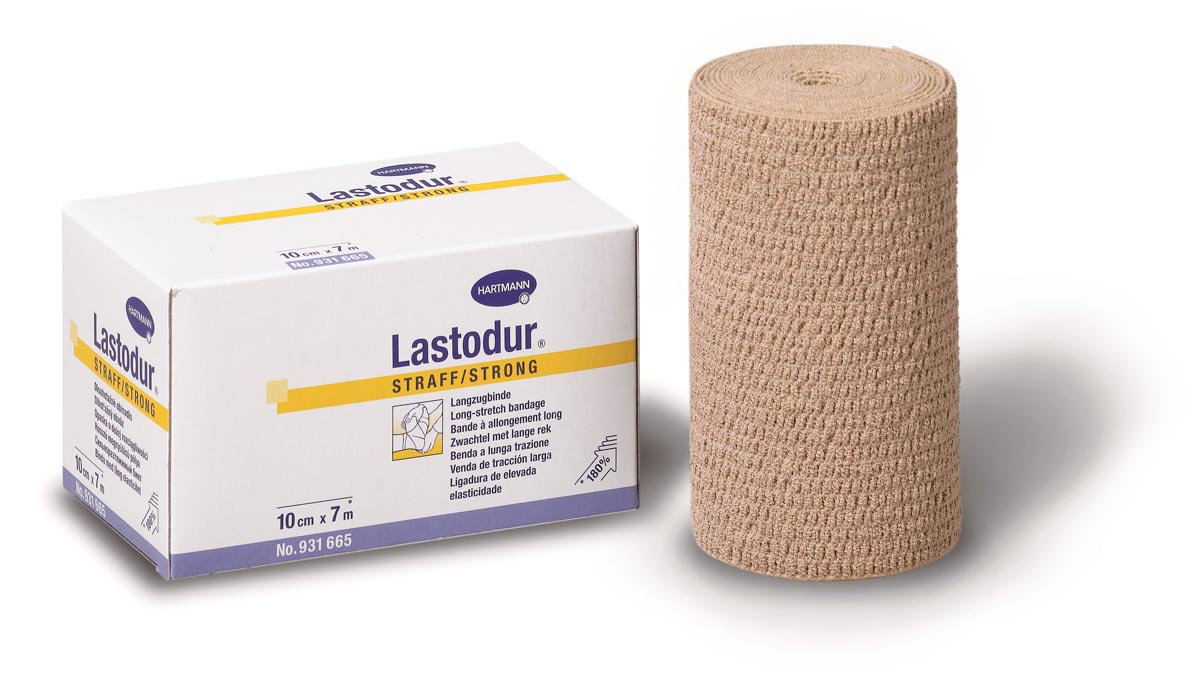 Lastodur Strong è una benda compressiva forte a lunga estensibilità (circa 180%), composta da cotone, poliammide ed elastan, color carne, che produce un effetto compressivo sul sistema venoso superficiale.