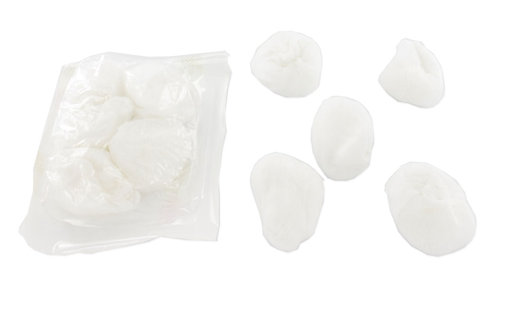 Tamponi chirurgici rotondi realizzati con unico telino di garza, con bordi tagliati privi di sfilacciature, opportunamente ripiegato all'interno, e chiusi internamente con anello elastico privo di lattice (latex free) sterilizzabile (non cede sostanze estranee né si deforma se sottoposto ai normali metodi di sterilizzazione), a garanzia della massima sicurezza durante l'impiego.