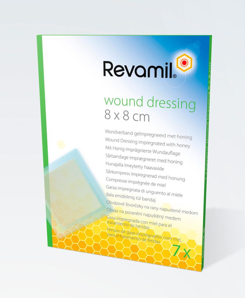 Revamil® Garze 8×8 cm Wound Dressing è una medicazione morbida in poliacetato impregnata di miele Revamil® puro al 100% e sterilizzata ai raggi gamma.