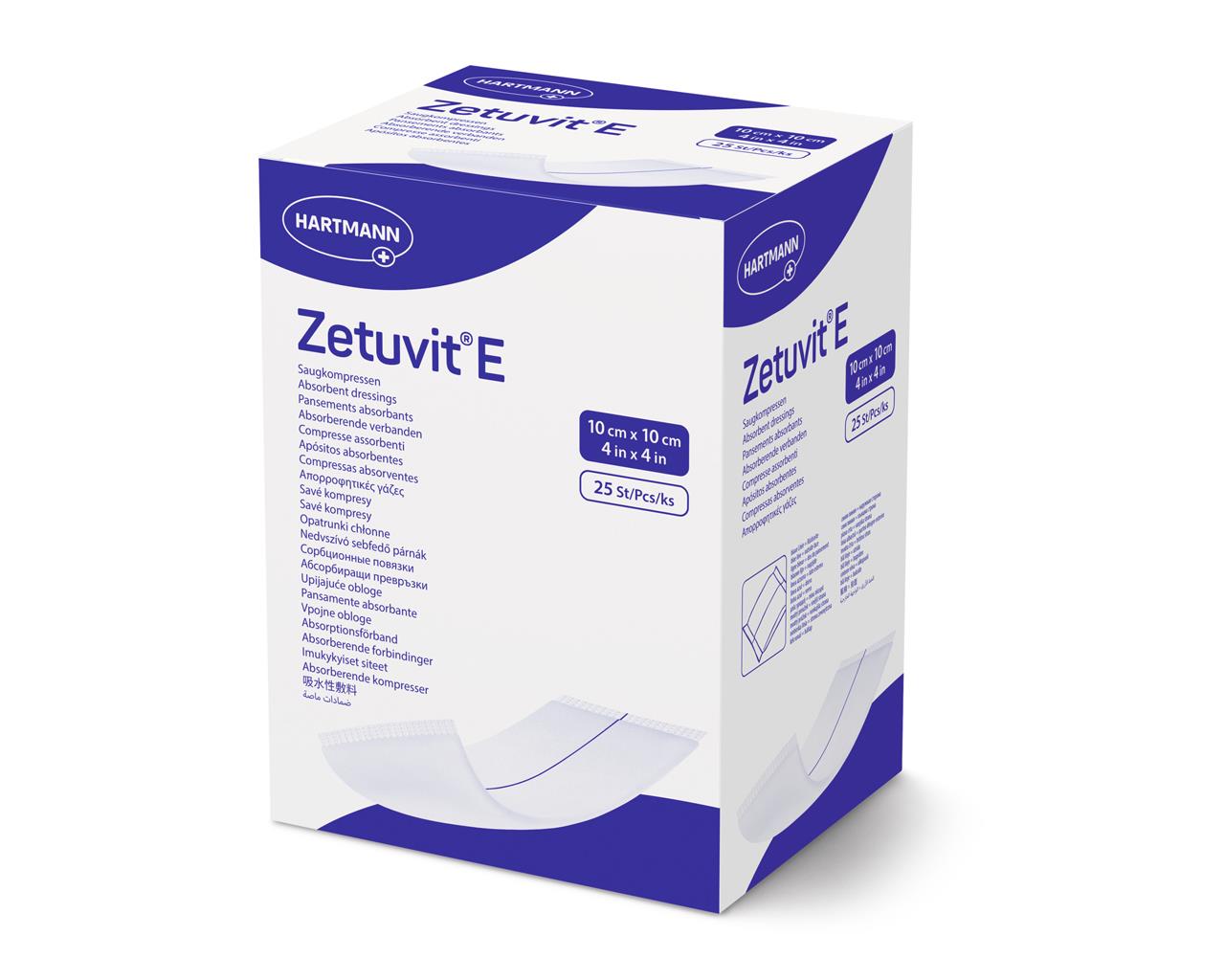 Medicazione assorbente in cellulosa sterile Zetuvit E ad alto potere assorbente, composta da 4 strati integrati fra loro. Lo strato interno è composto da fiocchi di cellulosa; mentre il rivestimento a supporto è in polipropilene di colore blu, idrofobo. Lo strato di rivestimento che è a contatto con la ferita è in TNT in poliammide/viscosa idrofilo.