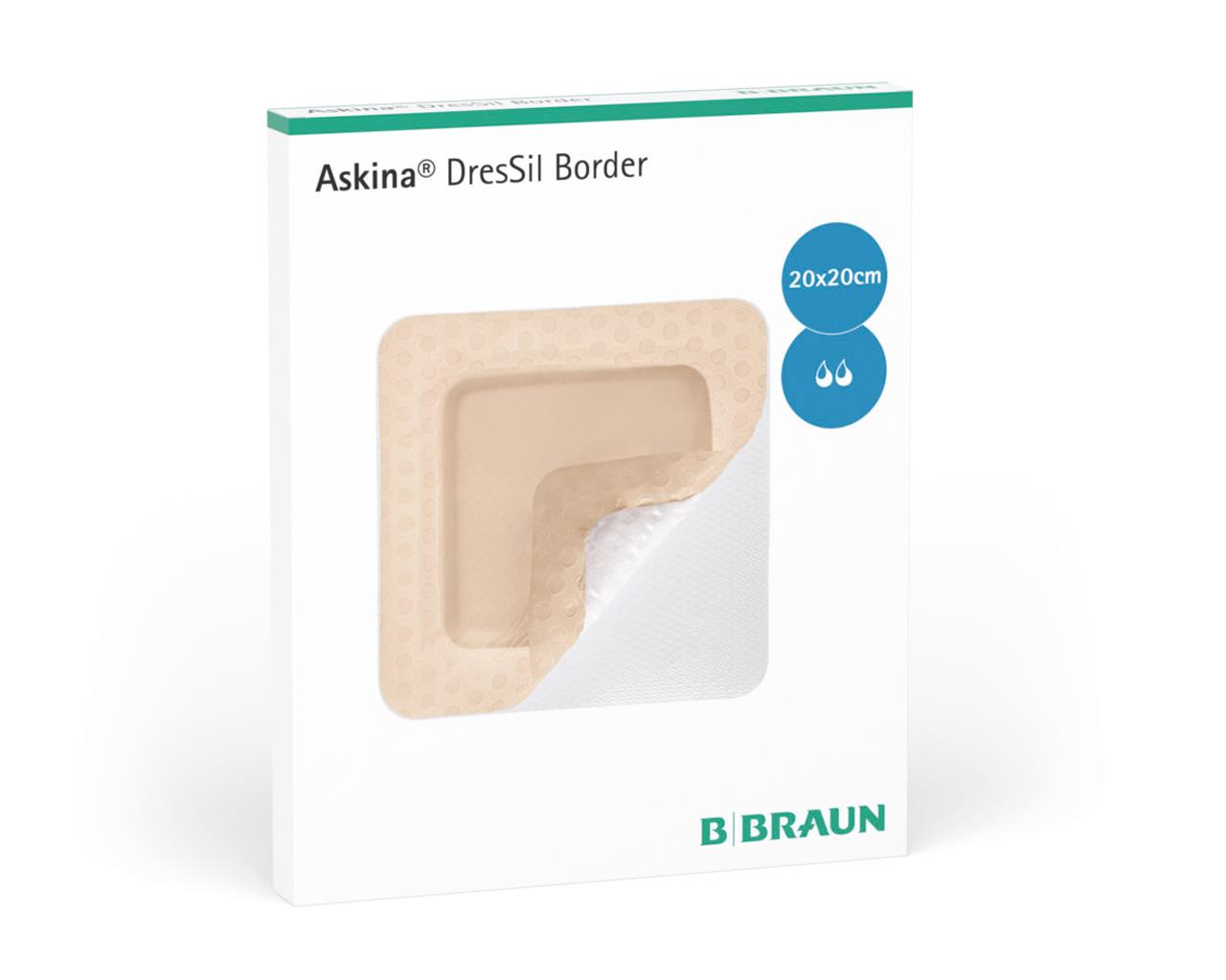 Askina® DresSil Border di B. Braun è una medicazione con microaderenza selettiva tristratificata, in schiuma di poliuretano che presenta, nel lato a contatto del letto della lesione, uno strato di silicone munito di numerosi fori che favoriscono il passaggio dell'essudato.