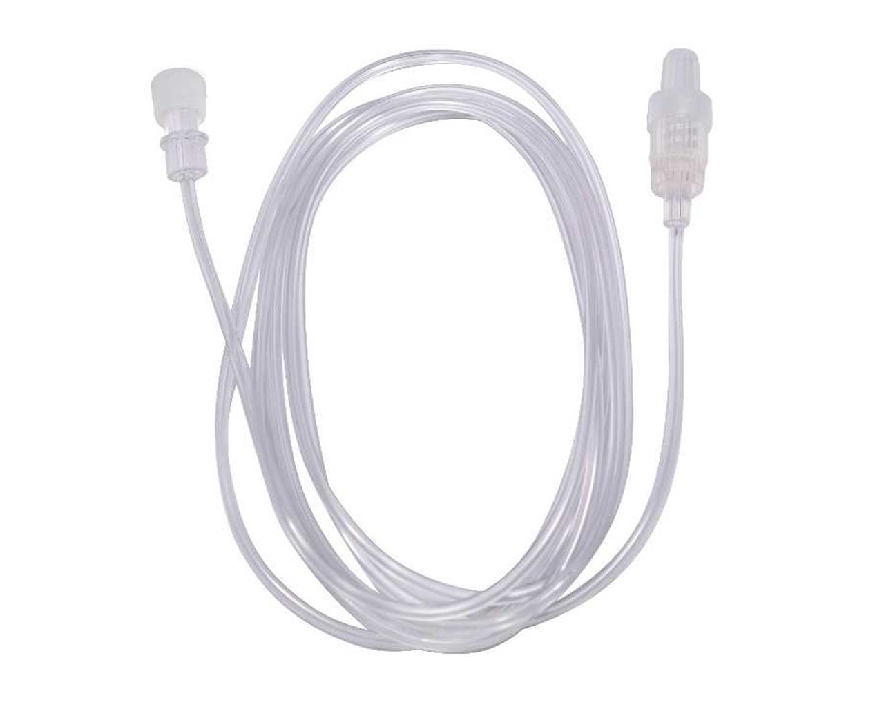 Prolunga per infusione in PVC dotata di luer lock maschio, con anello mobile, e luer lock femmina.
