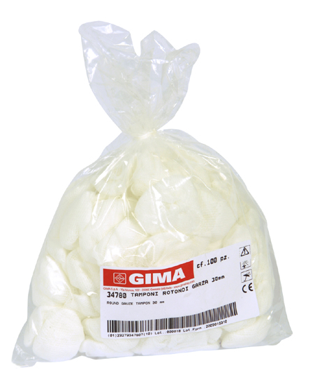 Tampone rotondo con elastico latex free non sterile, in morbida garza idrofila di puro cotone.