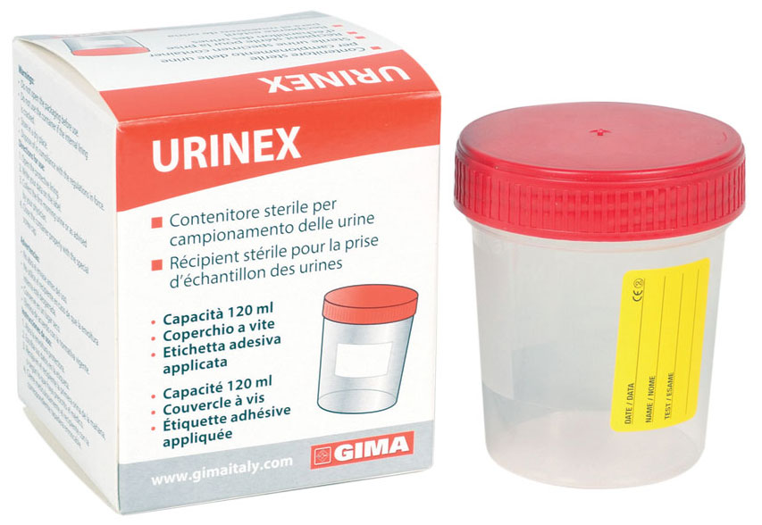 Contenitore sterile, in polipropilene, da 120 ml, graduato, con tappo rosso a vite, completo di scatola ed etichette.