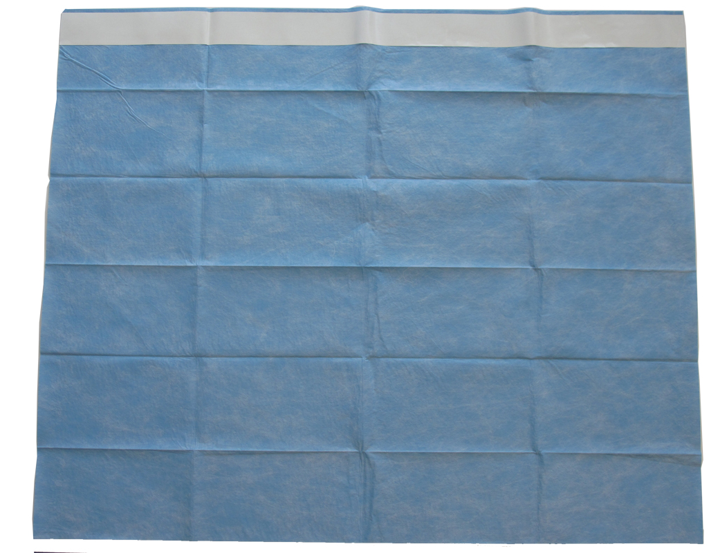 Teli chirurgici in TNT biaccoppiato di colore azzurro 54 g/m2 con un lato adesivo.