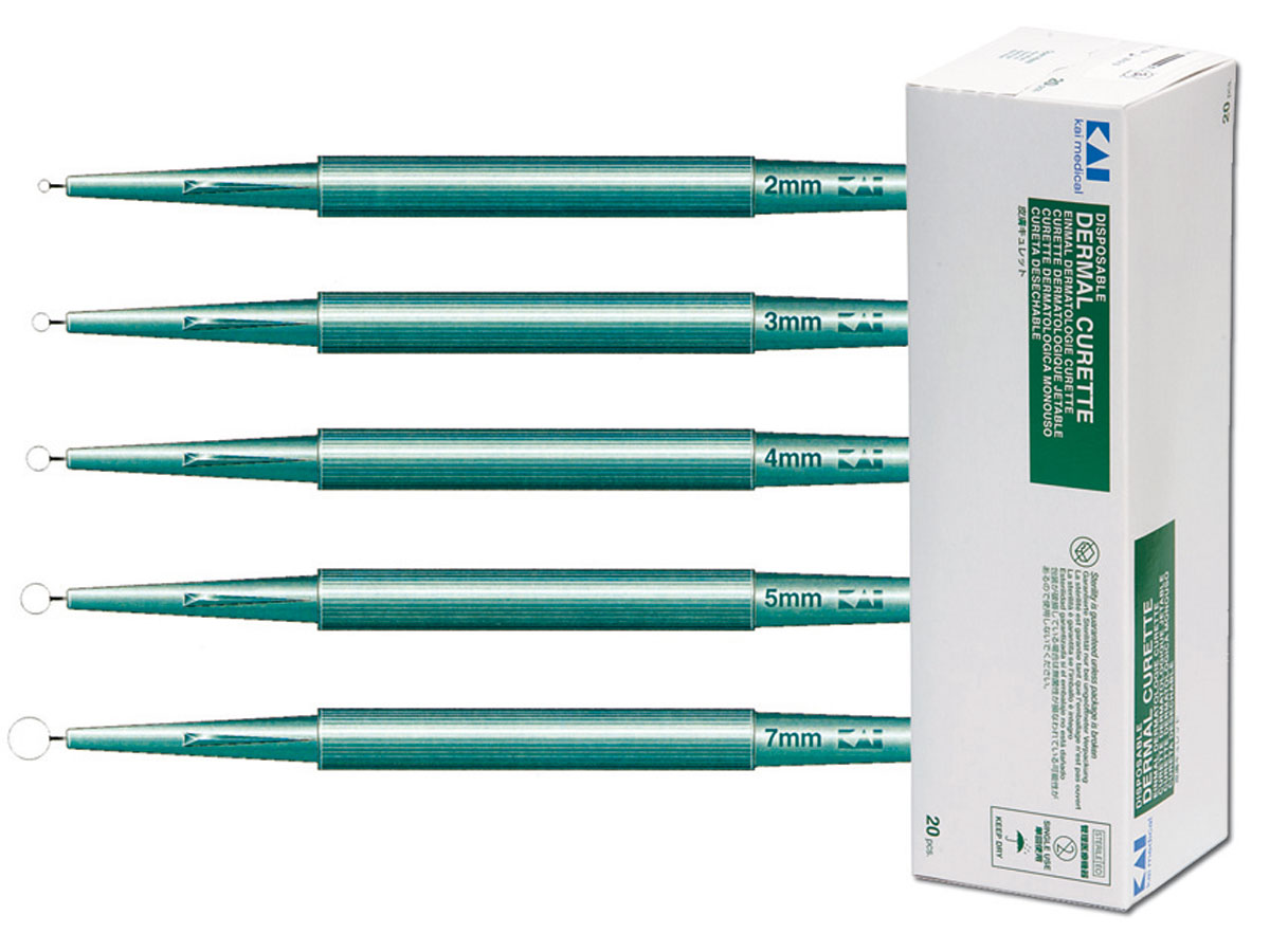 Curette per dermatologia dotate di lama in acciaio inossidabile molto affilata per tessuti molli o deboli e manico ergonomico in plastica.