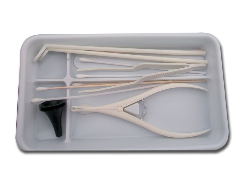 Kit ORL monouso sterile che include uno speculum nasale, un abbassalingua e due speculum auricolari, due specchietti laringei, una pinzetta il tutto in plastica, sei tamponi e una salvietta. Confezionato in una vaschetta in plastica sterile.