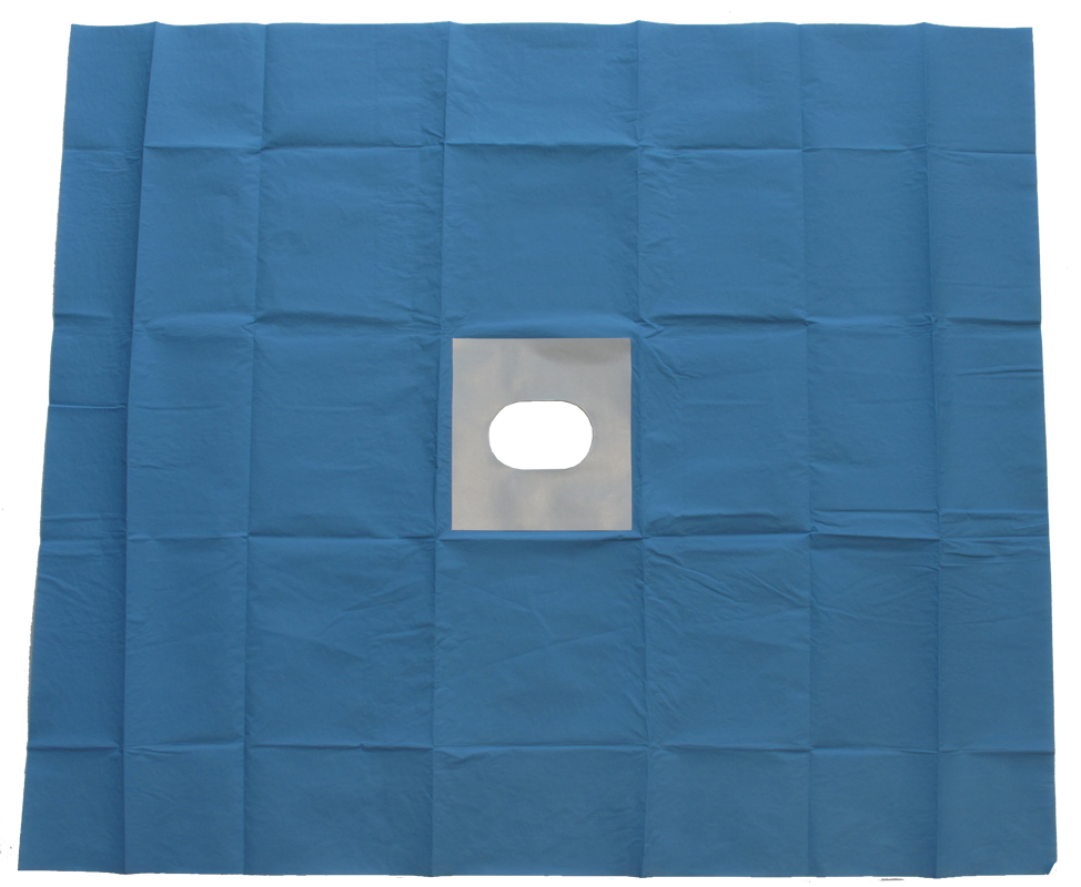 Teli chirurgici in TNT biaccoppiato di colore azzurro 54 g/m2 con foro centrale adesivo.