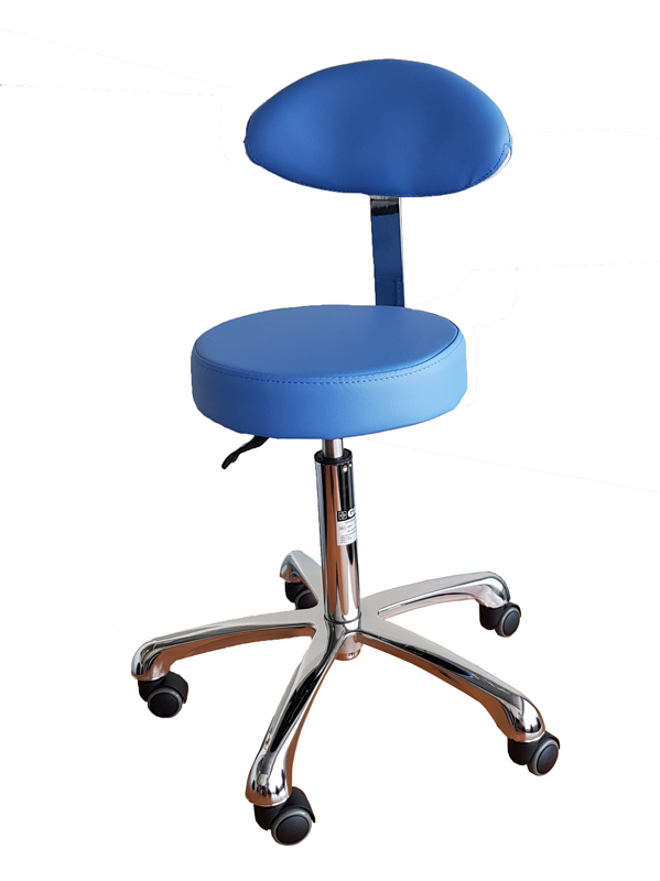 Sgabello in metallo, regolabile in altezza, con sedile e schienale imbottiti e rotelle.