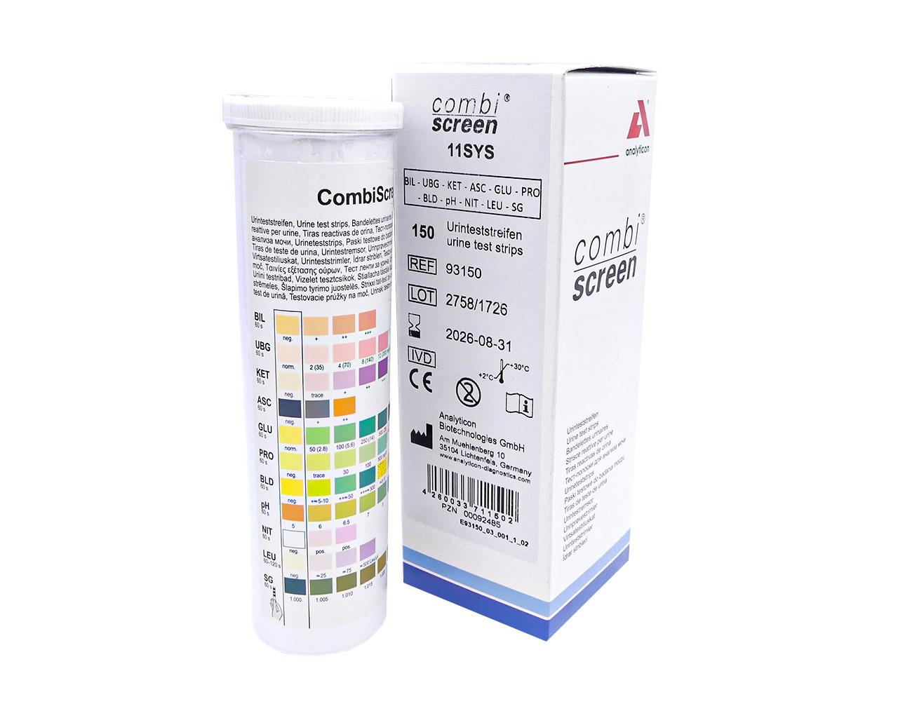 Strisce ANALYTICON per urine COMBI SCREEN SYS che consentono la valutazione di 11 parametri. Strisce prive di protezione dall'acido ascorbico.