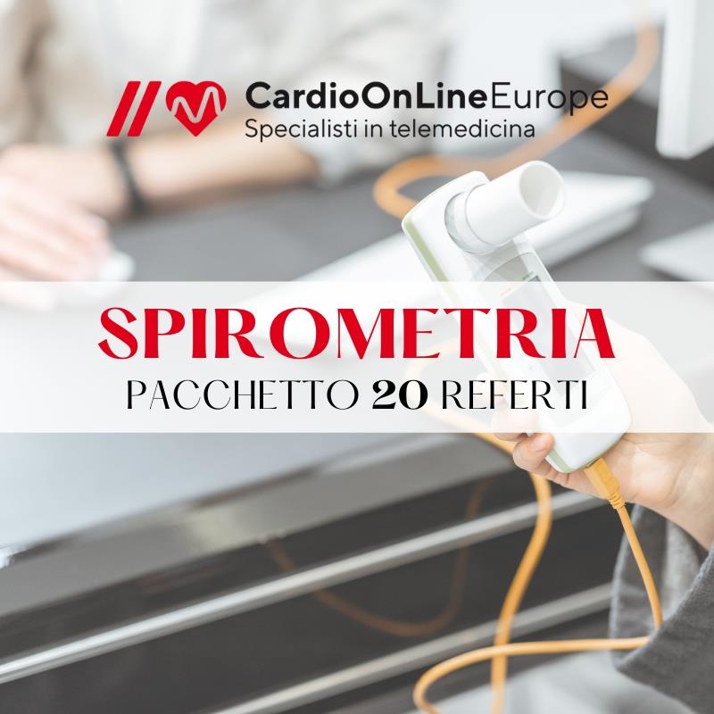 Il pacchetto Ricarica Referti Spirometria 20 di Cardio On Line Europe permette di usufruire di 20 referti spirometria, da utilizzare senza scadenza, con refertazione entro 48 ore dalla ricezione dell'esame.