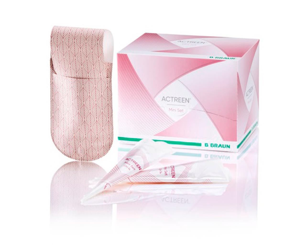 Actreen® Mini Set di B. Braun è un catetere femminile per cateterismo intermittente prelubrificato e pronto all’uso, con sacca di raccolta integrata.