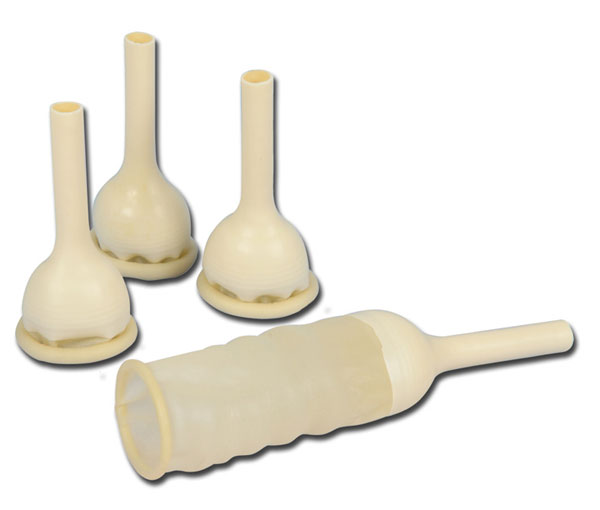 Cateteri esterni per uomo realizzati in lattice medico naturale. Il tappo zigrinato evita che il sistema di drenaggio possa arrotolarsi e che il flusso di urina venga bloccato.