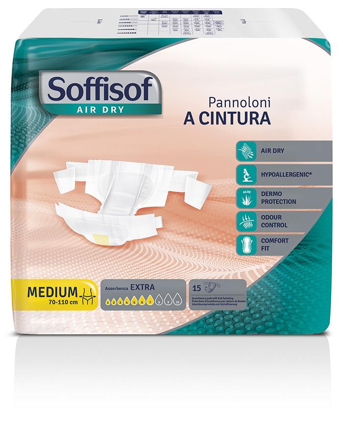 Il pannolone a cintura Soffisof Air Dry EXTRA è indicato per incontinenza urinaria e/o fecale da media e assicura la massima sicurezza e comfort a utilizzatori sia autosufficienti che allettati. Il materassino assorbente, è costituito da fluff di cellulosa vergine a fibra lunga certificata PEFC maggiormente concentrata nella porzione centrale. La presenza di speciali polimeri gelatinizzanti (SAP) con funzione super assorbente e di eliminazione degli odori, garantisce la massima efficacia in tutte le situazioni. Il telino filtrante in morbido tessuto non tessuto a contatto con la cute è dermatologicamente testato e imbibito con Aloe per una maggiore protezione della cute. Lo strato esterno impermeabile, in politene 100% traspirante accoppiato a tessuto non tessuto, assicura l’areazione della cute prevenendo macerazioni e irritazioni. Sempre sul lato esterno è presente un pratico indicatore di cambio che permette di verificare il grado di saturazione della protezione. Il fissaggio della protezione è assicurato da 2 morbide bande laterali con etichetta di chiusura riposizionabile tipo “velcro”.