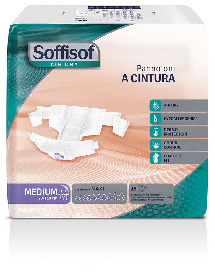 Il pannolone a cintura Soffisof Air Dry MAXI è indicato per incontinenza urinaria e/o fecale da grave a gravissima e assicura la massima sicurezza e comfort a utilizzatori sia autosufficienti che allettati. Il materassino assorbente, è costituito da fluff di cellulosa vergine a fibra lunga certificata PEFC maggiormente concentrata nella porzione centrale. La presenza di speciali polimeri gelatinizzanti (SAP) con funzione super assorbente e di eliminazione degli odori, garantisce la massima efficacia in tutte le situazioni. Il telino filtrante in morbido tessuto non tessuto a contatto con la cute è dermatologicamente testato e imbibito con Aloe per una maggiore protezione della cute. Lo strato esterno impermeabile, in politene 100% traspirante accoppiato a tessuto non tessuto, assicura l’areazione della cute prevenendo macerazioni e irritazioni. Sempre sul lato esterno è presente un pratico indicatore di cambio che permette di verificare il grado di saturazione della protezione. Il fissaggio della protezione è assicurato da 2 morbide bande laterali con etichetta di chiusura riposizionabile tipo “velcro”.