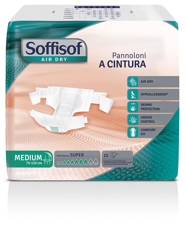 Il pannolone a cintura Soffisof Air Dry SUPER è indicato per incontinenza urinaria e/o fecale da media a grave e assicura la massima sicurezza e comfort a utilizzatori sia autosufficienti che allettati. Il materassino assorbente, è costituito da fluff di cellulosa vergine a fibra lunga certificata PEFC maggiormente concentrata nella porzione centrale. La presenza di speciali polimeri gelatinizzanti (SAP) con funzione super assorbente e di eliminazione degli odori, garantisce la massima efficacia in tutte le situazioni. Il telino filtrante in morbido tessuto non tessuto a contatto con la cute è dermatologicamente testato e imbibito con Aloe per una maggiore protezione della cute. Lo strato esterno impermeabile, in politene 100% traspirante accoppiato a tessuto non tessuto, assicura l’areazione della cute prevenendo macerazioni e irritazioni. Sempre sul lato esterno è presente un pratico indicatore di cambio che permette di verificare il grado di saturazione della protezione. Il fissaggio della protezione è assicurato da 2 morbide bande laterali con etichetta di chiusura riposizionabile tipo “velcro”.