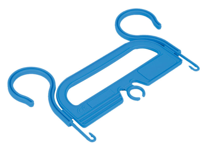 Comoda maniglia, di colore blu, per il sostegno delle sacche urina.