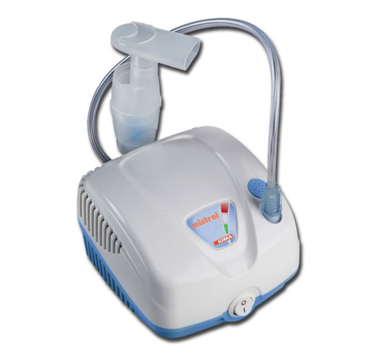 Compatto, portatile, facile da usare a casa. Ciclo di funzionamento: 20 min. on / 40 min. off. Fornito con ampolla Hi Flo, maschera per adulti e pediatrica con laccio, boccaglio, forcella nasale e un filtro.