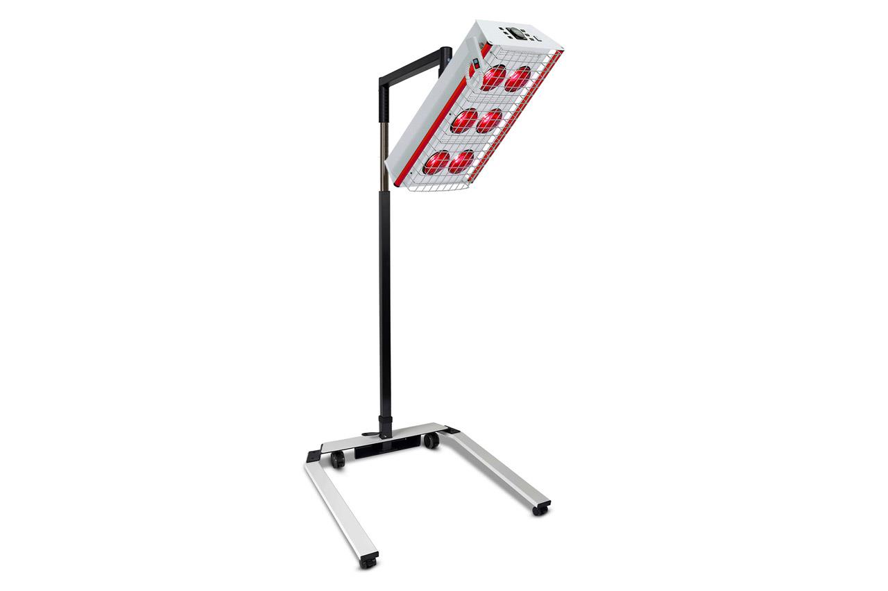 Apparecchiatura terapeutica a raggi infrarossi con 6 lampade da 150 W. Potenza nominale 900 W. L'accensione/spegnimento è possibile anche per singola lampada. Timer elettronico fino a 60 minuti, con funzione ripetizione. Lo stativo è dotato di quattro ruote frenanti e la base a U, alta solo 6,5 cm da terra, è adatta al posizionamento della lampada vicino sia ad una sedia che alla maggior parte dei lettini da trattamento.