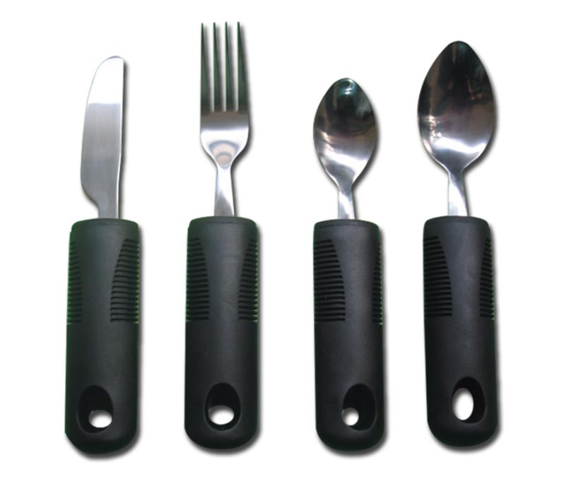 Posate leggere con impugnatura in gomma lunga 10 cm per persone con poca mobilità nelle mani. Per il loro particolare design, sono funzionali, pesano poco e proteggono le articolazioni della mano, riducendo le pressioni normalmente necessarie.