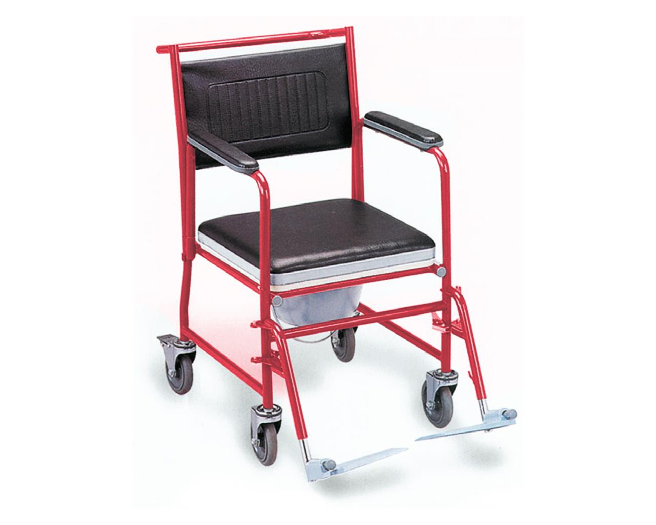 Sedia comoda con seduta da 44 cm caratterizzata da una verniciatura a polvere, telaio in acciaio, braccioli e poggiapiedi rimovibili, e solide ruote posteriori con bloccaggio.