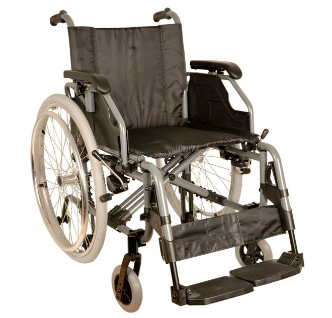Carrozzina in alluminio con braccioli, regolabili in altezza ed inclinazione.