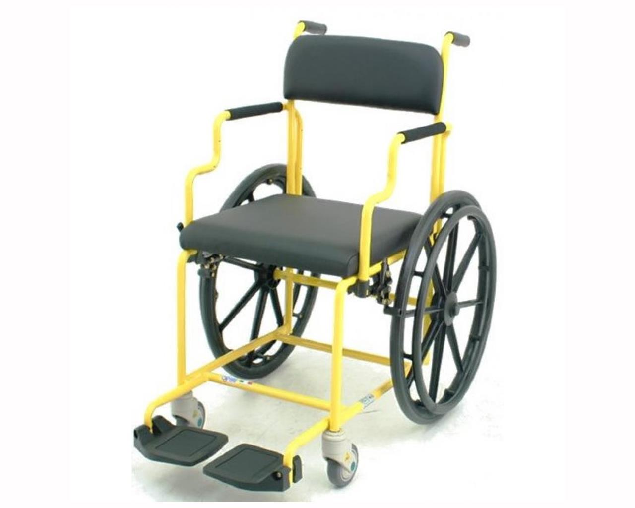Ruote posteriori diametro 600 mm, in plastica, imperforabili. Dotata di freni a leva.