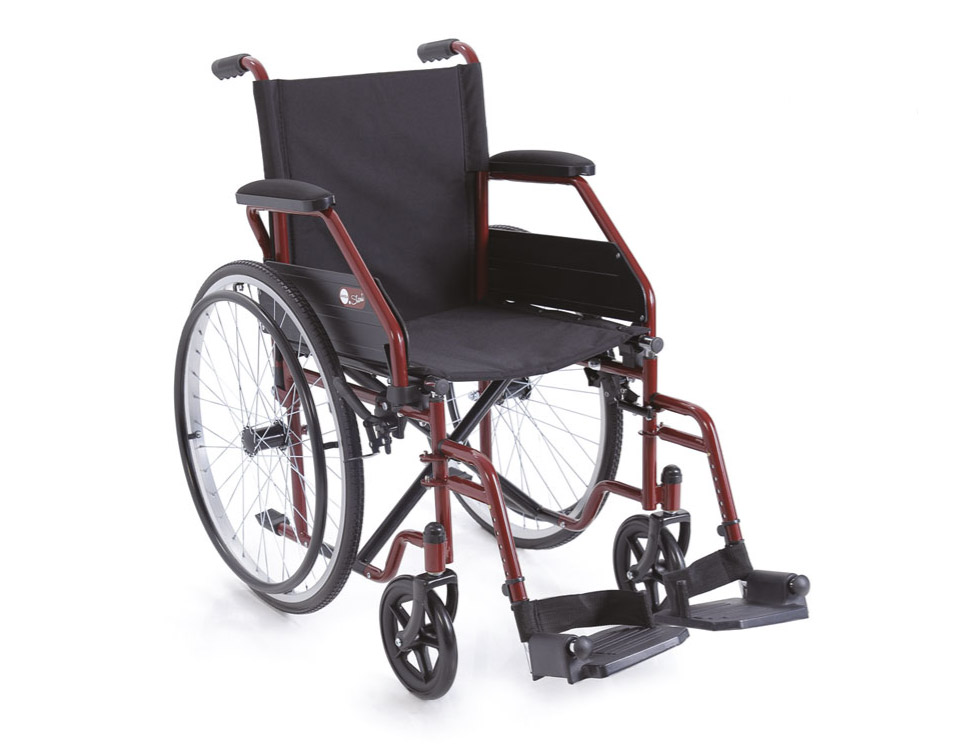 Carrozzina pieghevole costruita in acciaio verniciato colore rosso, singola crociera, seduta e schienale in nylon nero imbottito e lavabile, tasca portaoggetti nello schienale. Ruote anteriori in alluminio a razzi, gomme nere in PU senza camera d’aria e corrimano in acciaio verniciato nero. Ruote anteriori nere in PVC con forcella in acciaio. Braccioli corti ribaltabili e pedane estraibili regolabili in lunghezza. Cinturino fermapiedi.