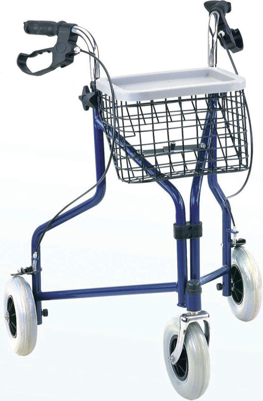 Struttura in acciaio blu, dall'altezza regolabile. Con 3 ruote solide (2 fisse posteriori con freno e 1 anteriore piroettante). Fornito con cestello e vassoio.