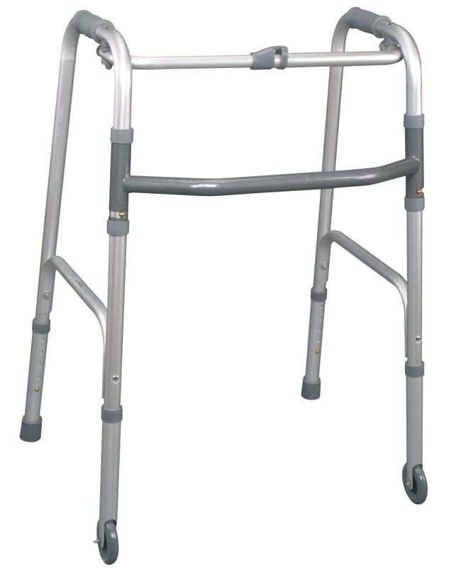 Deambulatore pieghevole con un pulsante, costruito in alluminio anodizzato con manopole imbottite, dotato di due ruote fisse frontali e due gambe posteriori, puntali in gomma antiscivolo.