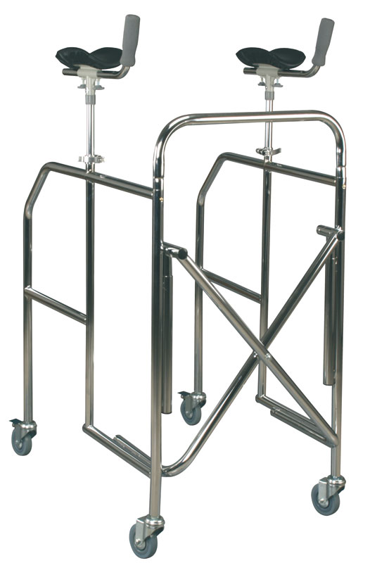 Deambulatore pieghevole con appoggio antibrachiale. Costruiti in acciaio cromato con 4 ruote piroettanti di 80 mm di cui 2 con freni, supporti regolabili in altezza. Sedile optional.