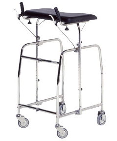 Deambulatore in acciaio cromato con quattro ruote di cui due piroettanti e due direzionali con freni. Completo di ripiano imbottito regolabile in altezza da cm 115 a 144. Impugnature ergonomiche regolabili con dispositivo di frenata.