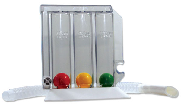 Esercitatore respiratorio per la riabilitazione respiratoria attraverso l'inspirazione in seguito ad un intervento addominale o toracico. Il flusso dell'aria non si interrompe dopo aver alzato le tre palline. Non diffonde particelle dannose per la salute.
