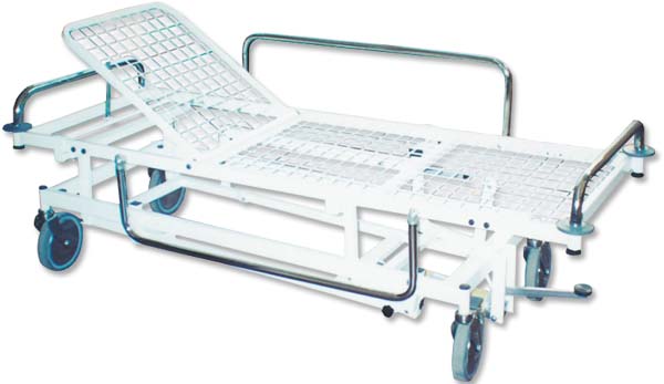 Letto degenza con ruote in lega di acciaio, verniciata a fuoco ral 9010 e maniglie in lega di acciaio. Produzione italiana.