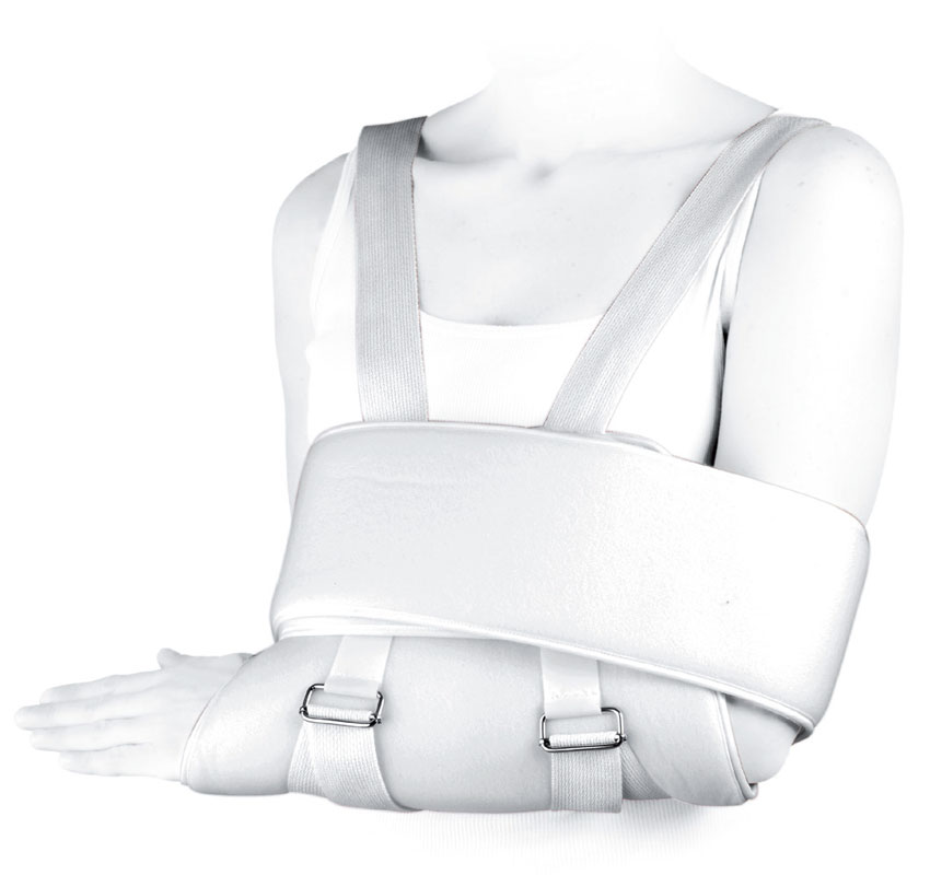 Immobilizzatore di spalla con reggibraccio. Realizzato in gommapiuma rivestito in maglina anallergica. Misura unica.