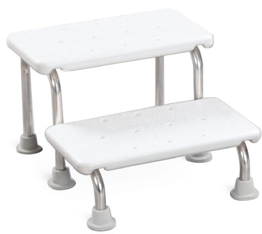 Gradino da bagno a due gradini con struttura in acciaio e basi in plastica.