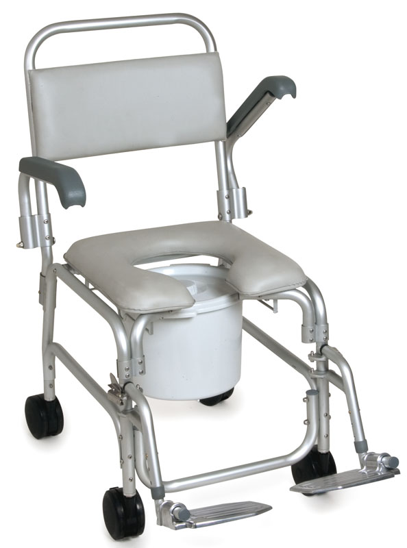 Sedia per doccia e per bagno. Struttura totalmente in alluminio anodizzato, braccioli ribaltabili, pedane poggiapiedi in alluminio ribaltabili lateralmente, estraibili e regolabili in lunghezza. Sedile e schienale imbottiti in PVC termosaldato.
