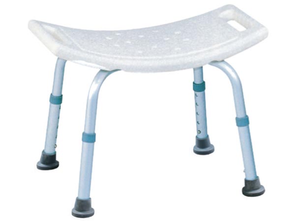 Sgabello da doccia con struttura in alluminio e sedile in plastica.
