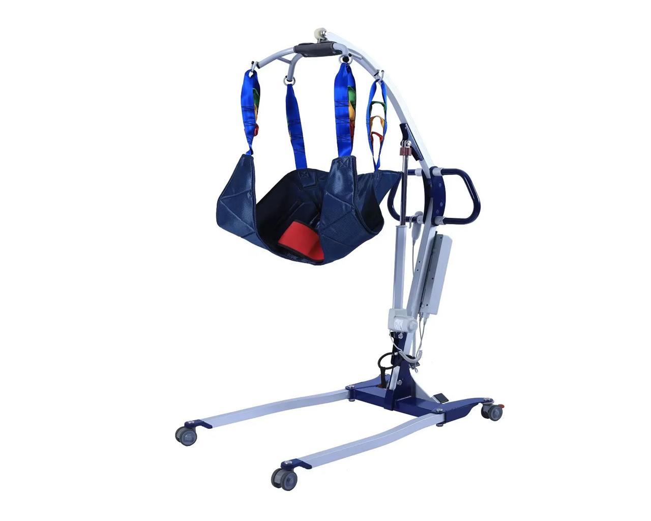 Sollevatore ad alimentazione elettrica con struttura in alluminio e superficie rivestita, ideato per sollevare e trasferire i pazienti dal letto alla sedia a rotelle e viceversa.